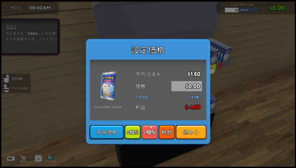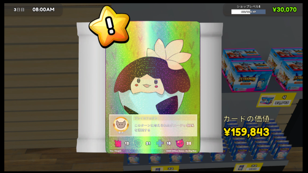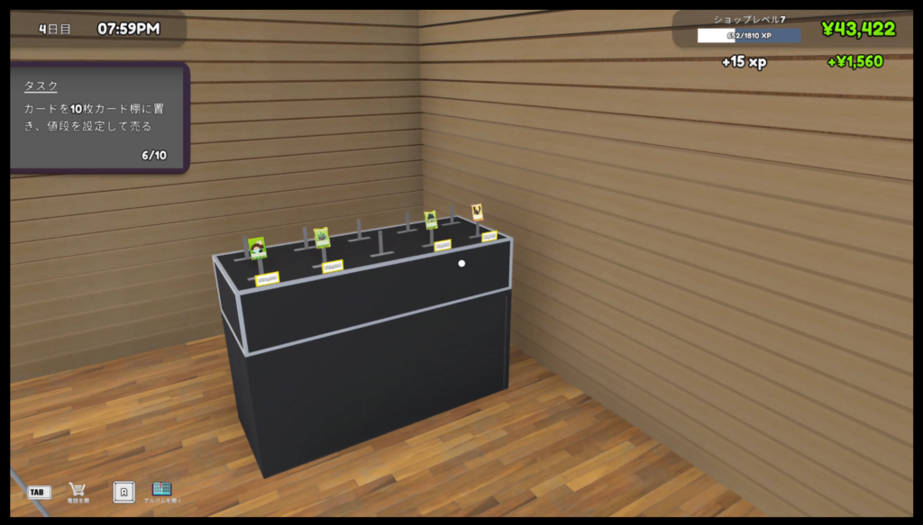 そんな感じで、【TCG CARD SHOP SIMULATOR】やってみました。今のところ正直盛り上がり感が無いです(ハッキリ)あまりにも絵面が地味すぎる。15万円のカードが出て来たときは「うひょひょww」ってなったけど、全然売れないんだもん!500〜600円ぐらいのカードばっかり売れて、15万円の高額カードはだ〜れも手に取ってくれません。いくら15万円の価値があっても売れないんじゃ0円と同じです。
