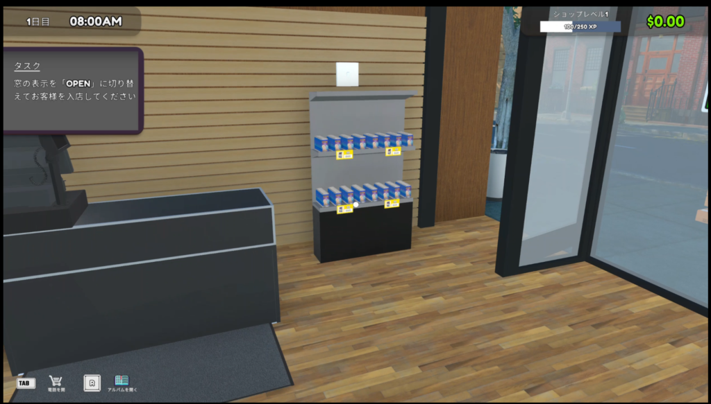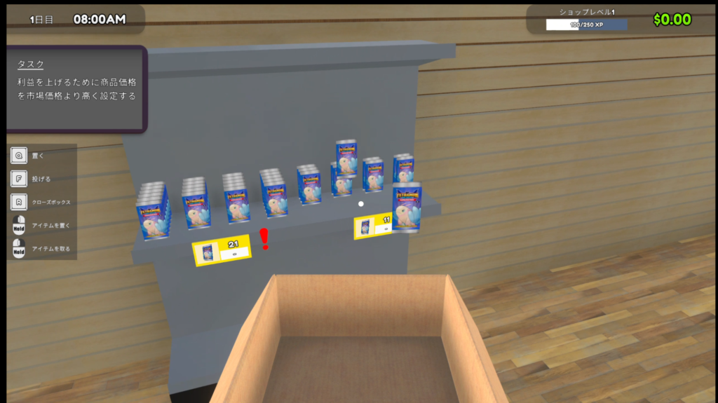 このゲームは基本的にキーボードとマウスで操作をするのですが、全体的に直感的な操作が難しく、不器用な僕は、何回も箱を開ける動作と箱をぶん投げる動作を逆にやってしまい、箱を床に叩きつける奇行を繰り返す限界店員になっていました。