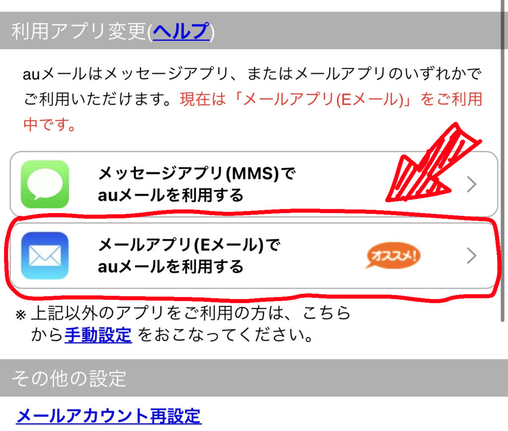 その中にある、「メールアプリ(Eメール)でauメールを利用する」をクリック