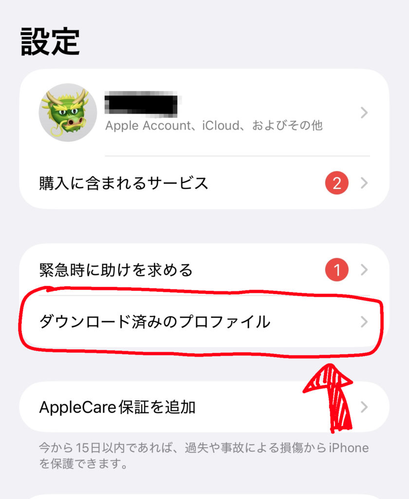 で、iPhone本体の設定アプリを開くと、トップに「ダウンロード済みのプロファイル」が現れるのでそれをクリック。