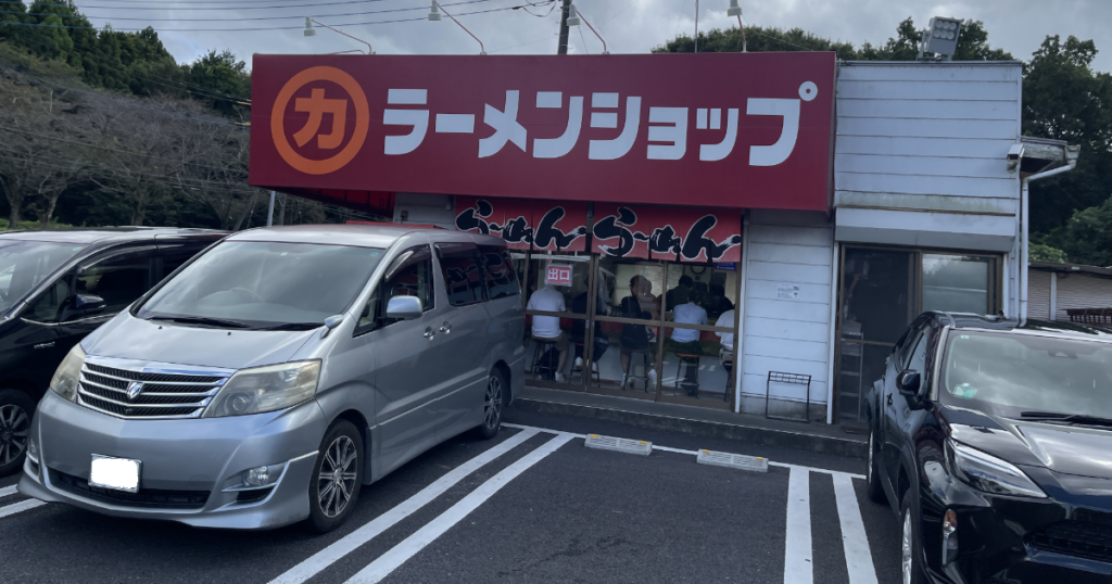 あれ?山の中かな?と思った方、なんとこれラーショ牛久結束店の駐車場の裏です。こんなところに良く店を構えようとしたよな〜と感心するほど。「この土地にラーメン店を建てましょう!」なんて部下が言って来たら僕ならぶん殴ってる。それぐらい「だれが来るねん!」という場所にある。駅からも遠いし、確実に車で来る必要がある。